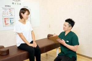 整骨院では、まず丁寧な問診を通じて、いつから、どのような時に痛みを感じるのか、日常生活での体の使い方や過去の怪我の有無などを詳しくお伺いします。